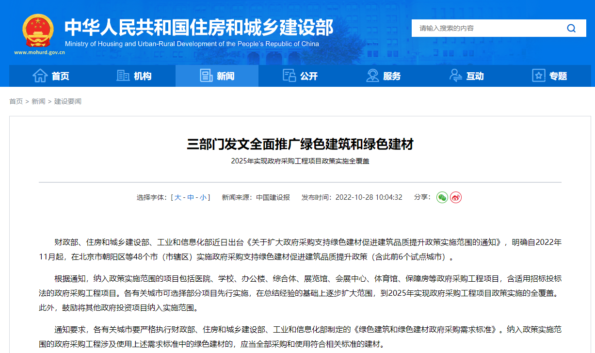 財政部、住房和城鄉(xiāng)建設(shè)部、工業(yè)和信息化部近日出臺《關(guān)于擴大政府采購支持綠色建材促進建筑品質(zhì)提升政策實施范圍的通知》,明確自2022年11月起,在北京市朝陽區(qū)等48個市(市轄區(qū))實施政府采購支持綠色建材促進建筑品質(zhì)提升政策(含此前6個試點城市)。根據(jù)通知,納入政策實施范圍的項目包括醫(yī)院、學校、辦公樓、綜合體、展覽館、會展中心、體育館、保障房等政府采購工程項目,含適用招標投標法的政府采購工程項目。各有關(guān)城市可選擇部分項目先行實施,在總結(jié)經(jīng)驗的基礎(chǔ)上逐步擴大范圍,到2025年實現(xiàn)政府采購工程項目政策實施的全覆蓋。