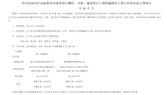2018年4月11日,我司中標(biāo)“漢川市2018年高標(biāo)準(zhǔn)農(nóng)田項(xiàng)目”,該項(xiàng)目位于湖北省漢川市,項(xiàng)目規(guī)模約17萬畝,對(duì)漢川市2018年高標(biāo)準(zhǔn)農(nóng)田建設(shè)項(xiàng)目進(jìn)行測(cè)繪、可行性研究、規(guī)劃設(shè)計(jì)與預(yù)算編制,中標(biāo)金額為544.21萬元,中標(biāo)單價(jià)為新建1萬畝(36.68萬元)和補(bǔ)建一萬畝(26.10萬元)。
